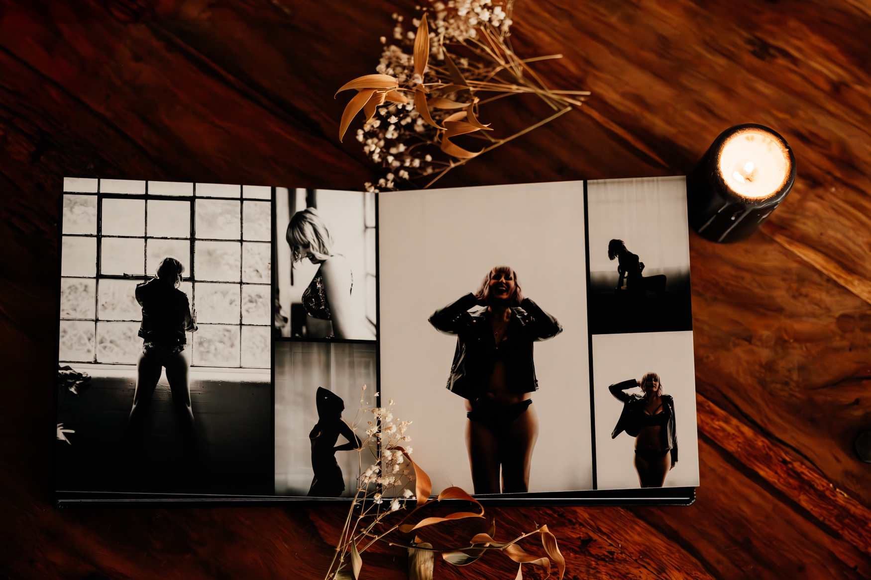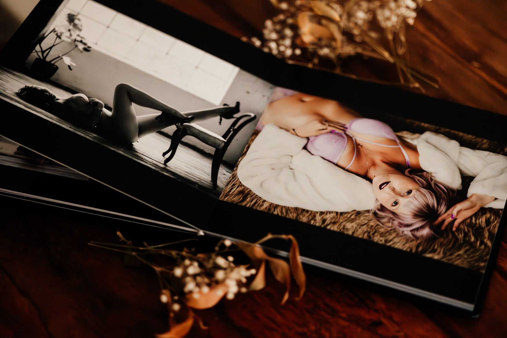 These high-quality 8×8″ boudoir albums lay flat and have a beautiful black leatherette cover. Your images will be printed on beautiful Fuji Silk paper and are seamlessly designed to flow throughout your album. These albums are handcrafted in the heart of Europe and you can usually expect to receive your finished product within two to three weeks of deciding which images to include.